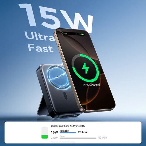 The JOYROOM 10000mAh Magnetic Wireless Power Bank with Holder offers a reliable and convenient charging solution. Its 10000mAh capacity ensures ample power for multiple device charges, while the magnetic wireless feature allows effortless attachment and charging of compatible smartphones. The integrated holder provides secure support, making it ideal for on-the-go use. Designed for efficiency and ease, this power bank combines portability with advanced wireless technology to keep your devices powered anytime, anywhere.